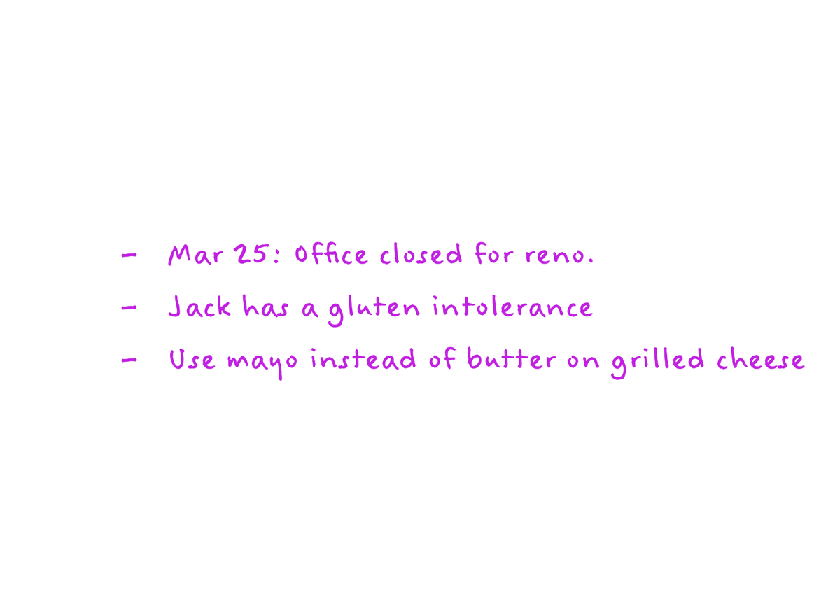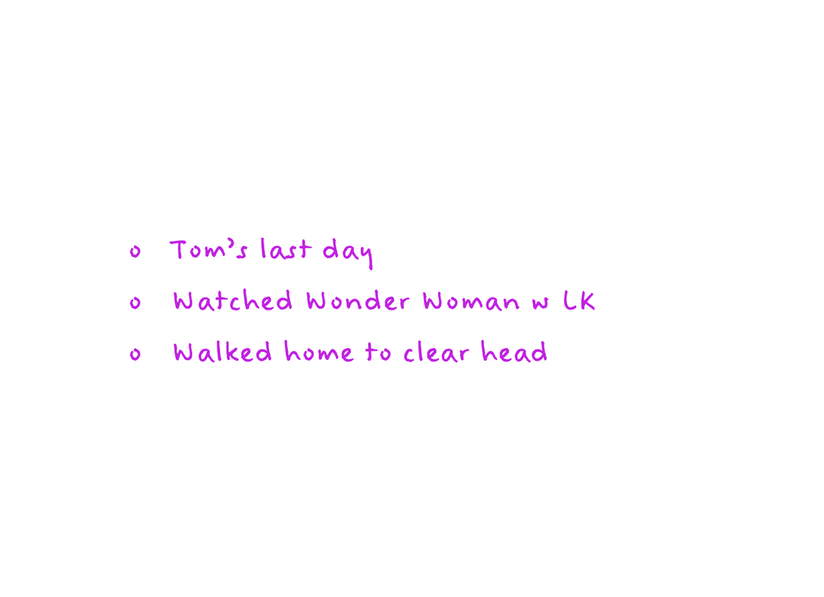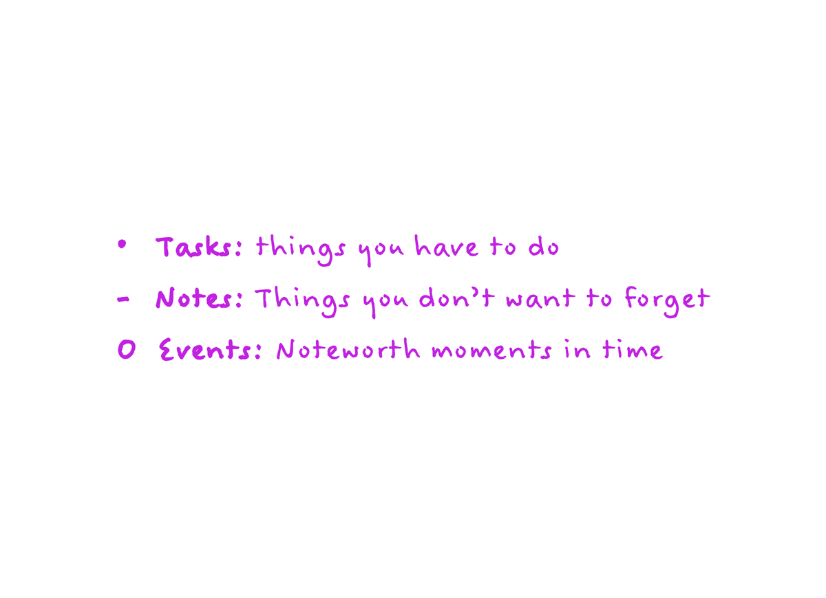 Tasks, Events, and Notes will help you quickly capture your thoughts as they bubble up throughout the day. Don't worry about logging them in any particular order. The important thing is to get them out of your head, and onto the page.