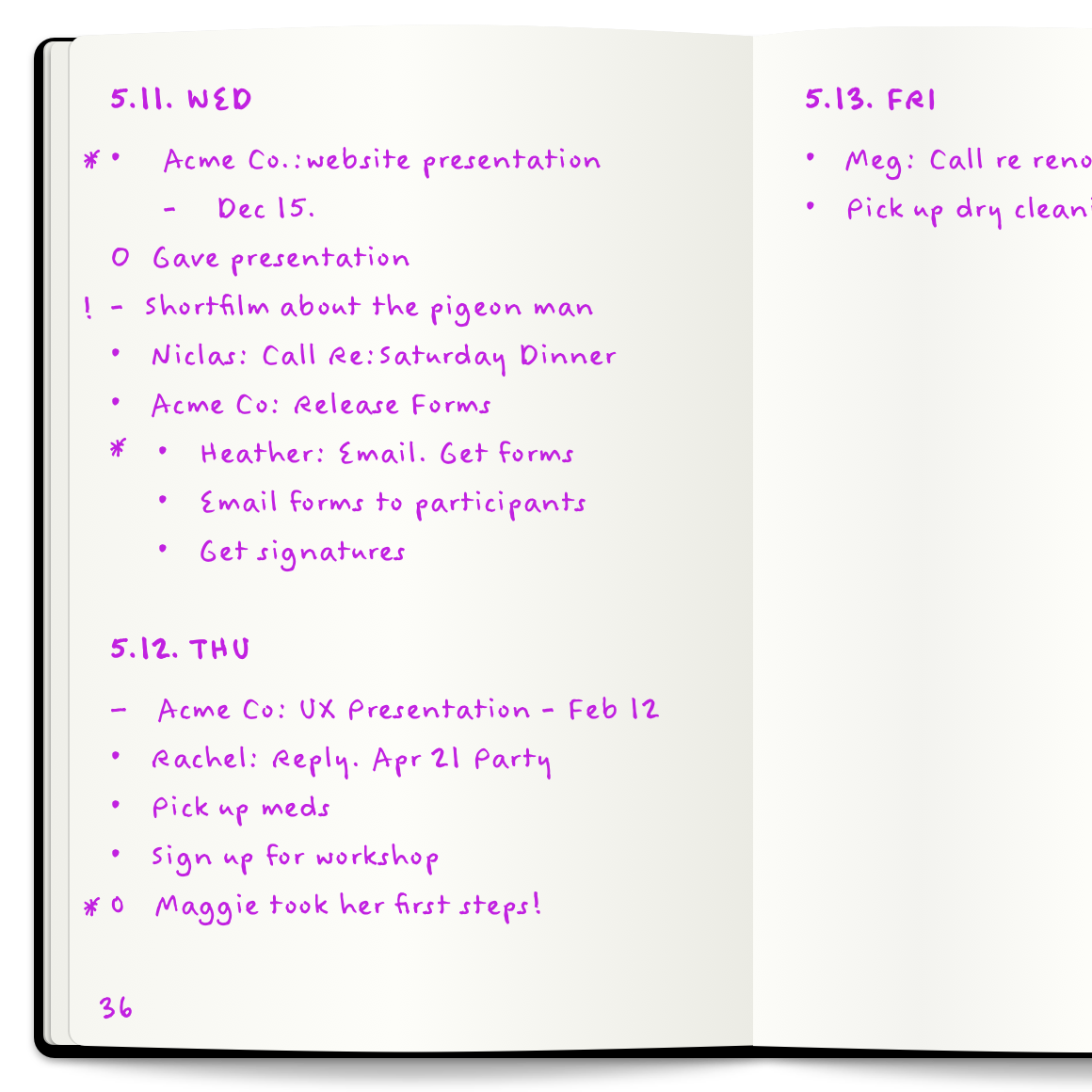 Signifiers are symbols that give your entries additional context at a glance. They're placed to the left of Bullets so they stick out, making them easy to spot when scanning your pages. Here are two useful examples, but feel free to come up with your own.
