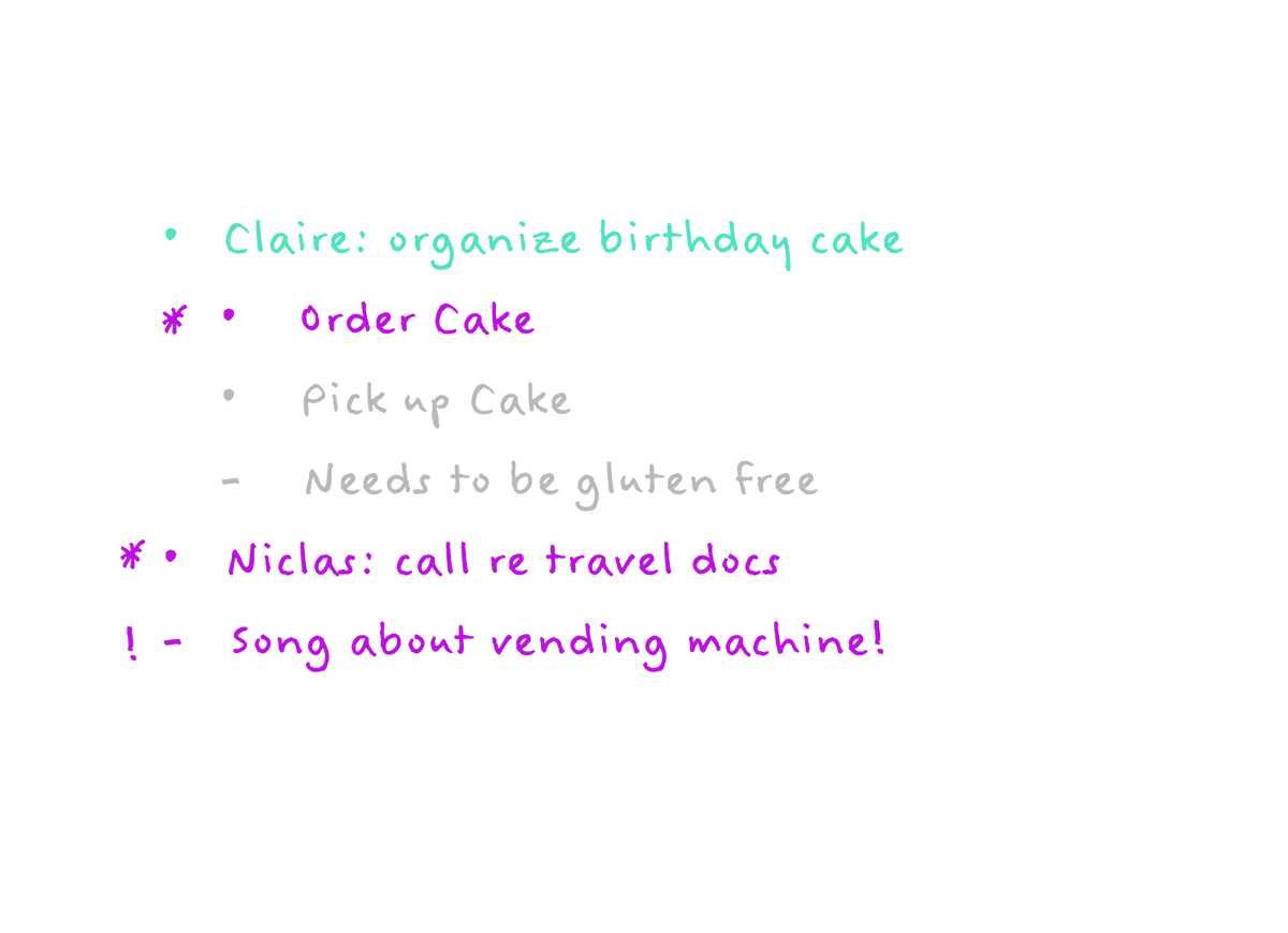 - = 优先级。用来标记列表中最重要的事情。尽量少用它。如果每件事都是优先级,那就什么都不是了。