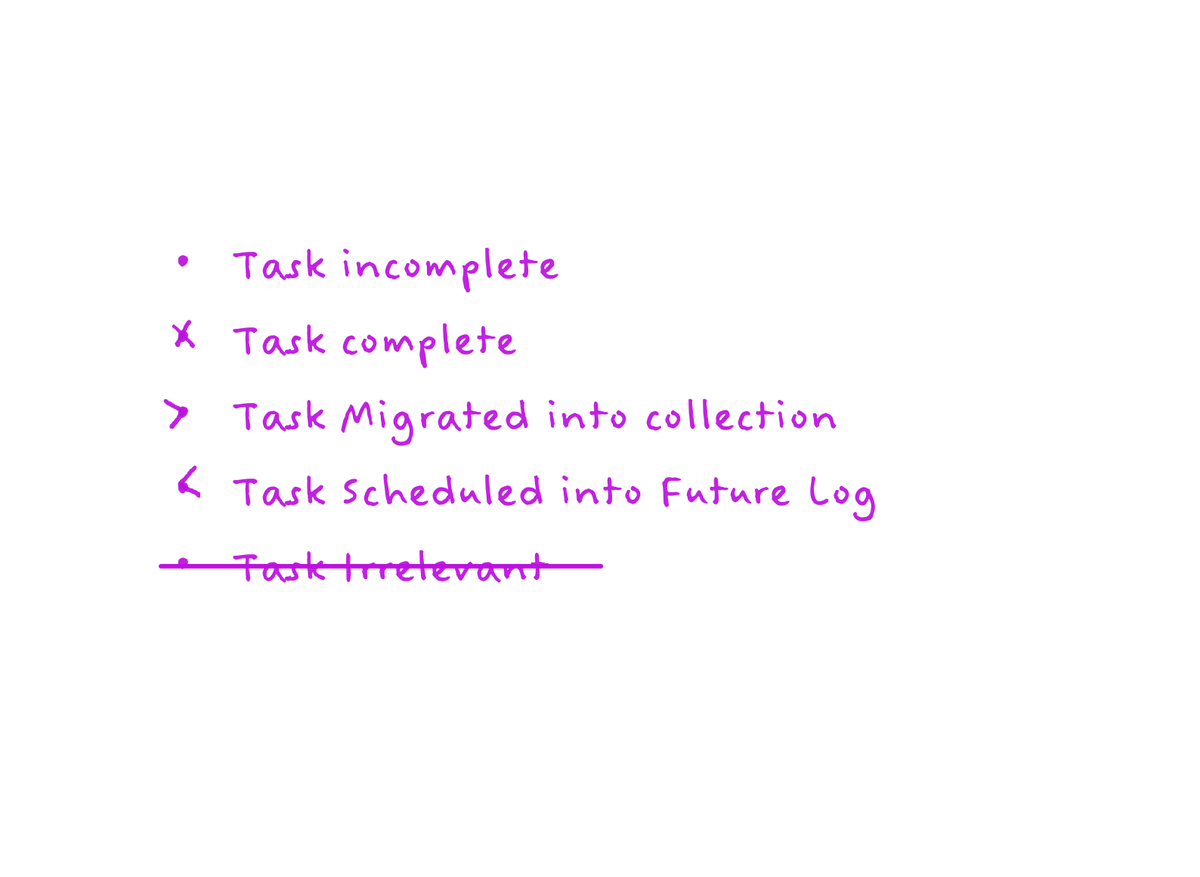 To Migrate a Task, simply turn the "•" into ">" to indicate that you’ve moved that Task forward onto the Task Page of your new Monthly Log or into an appropriate Collection. If you wrote down a book title for example, you would migrate that entry into your "Books to Read" Collection.